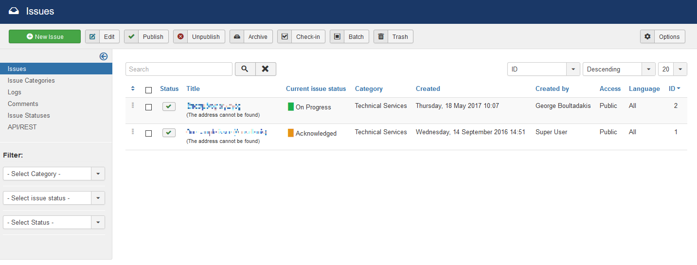 - Presents a list of issues with the essential information and a detailed page per issue with the full set of submitted details.